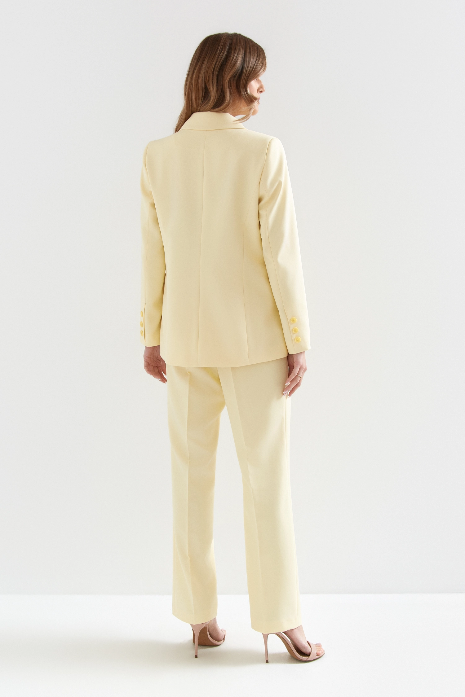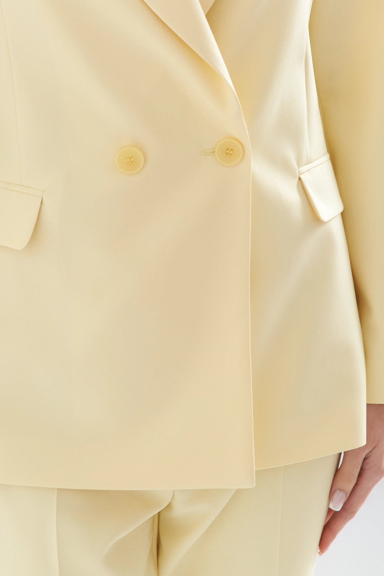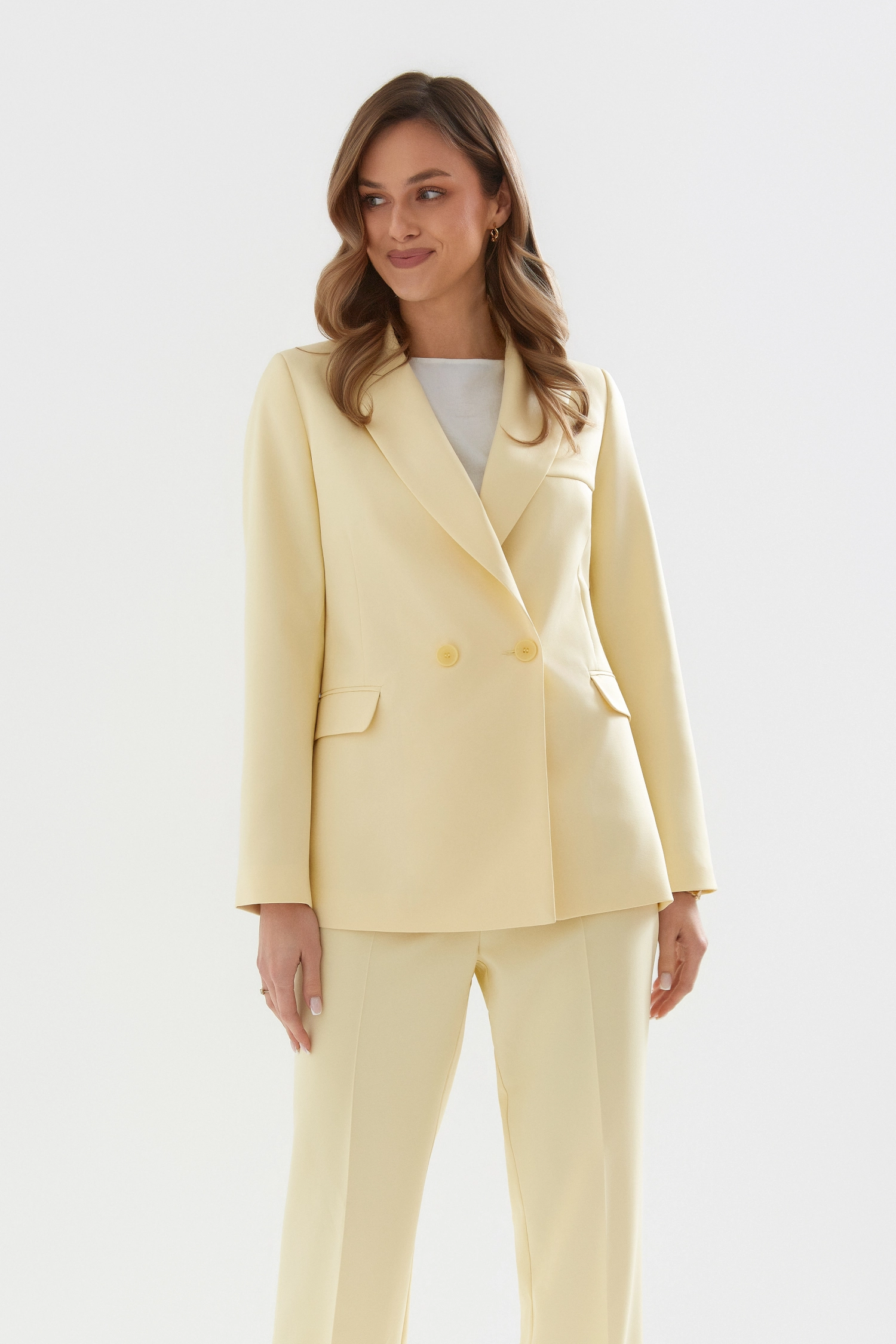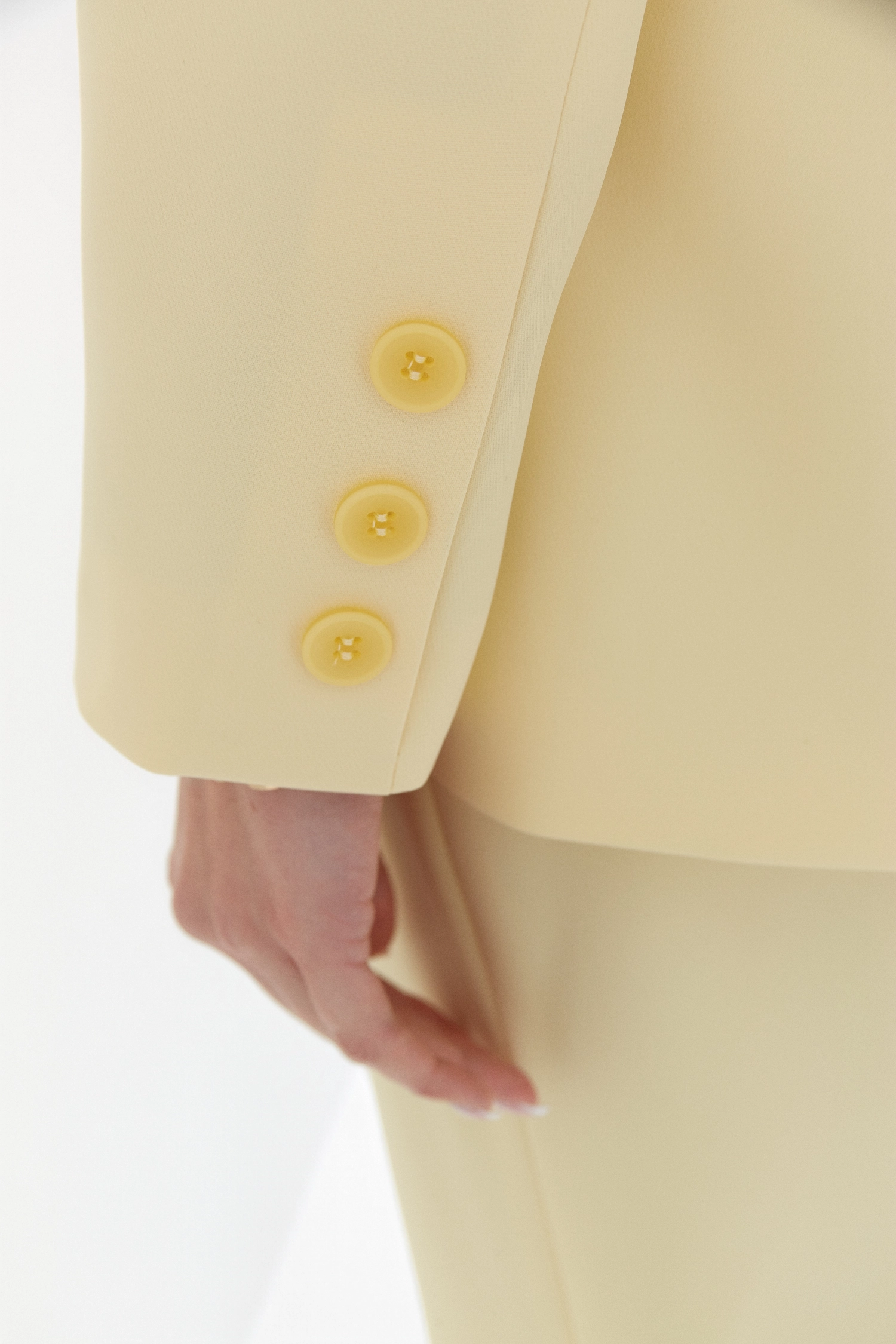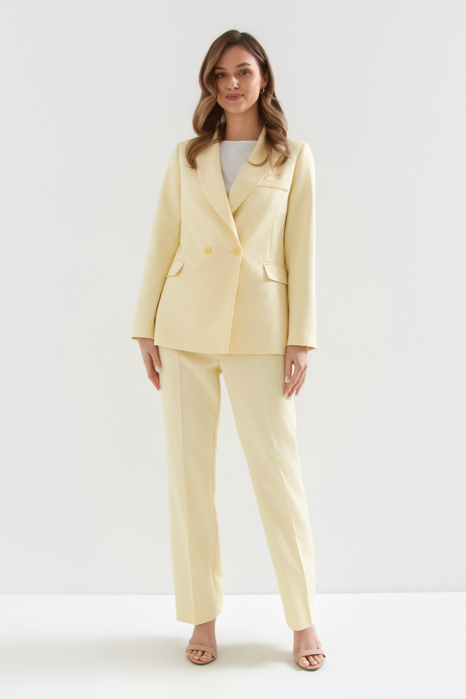 Bananowy garnitur damski Marta to kwintesencja klasy i szyku. Stworzony z myślą o nowoczesnych kobietach ceniących sobie zarówno elegancję, jak i wygodę. Garnitur wykonany jest z wysokiej jakości tkaniny.