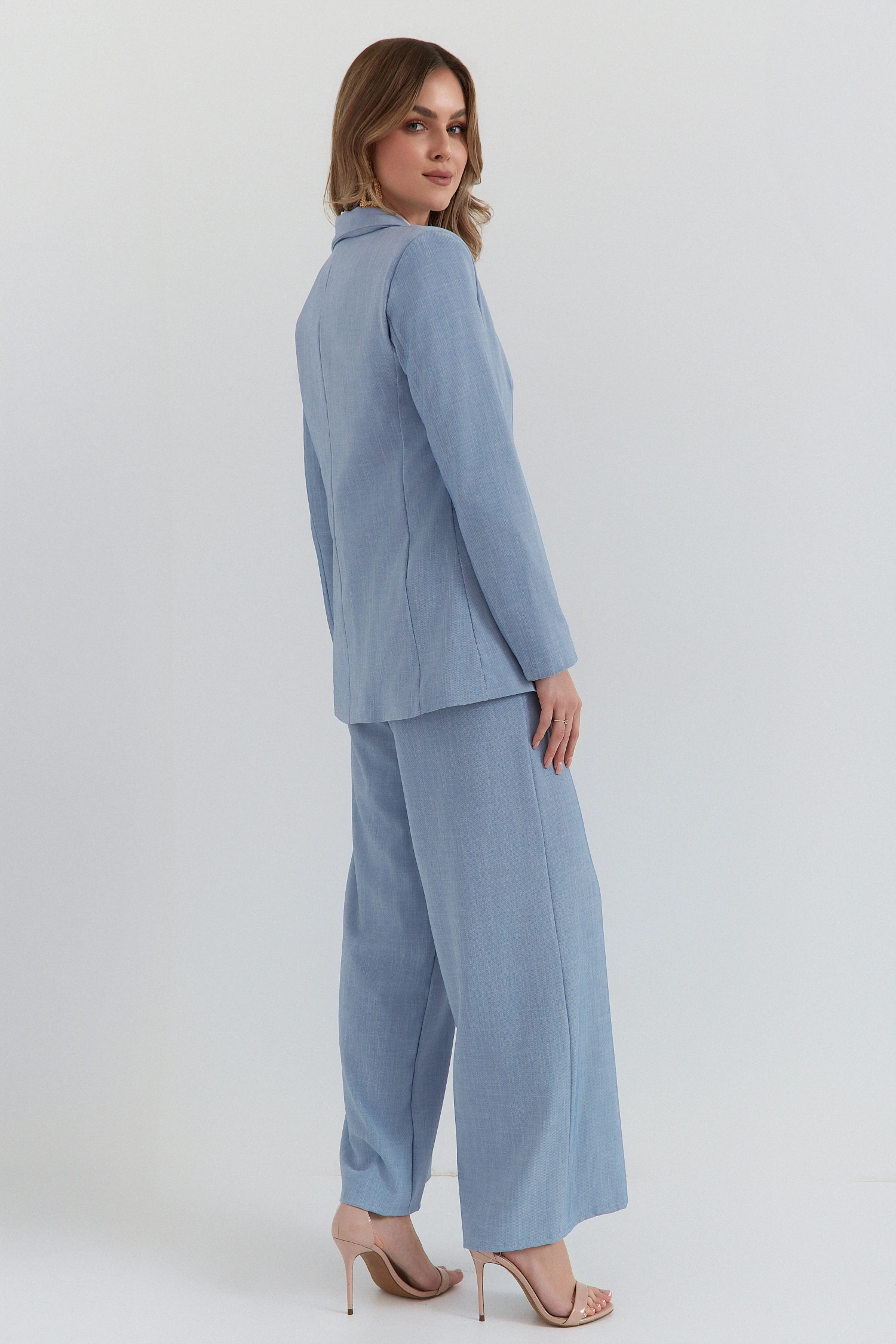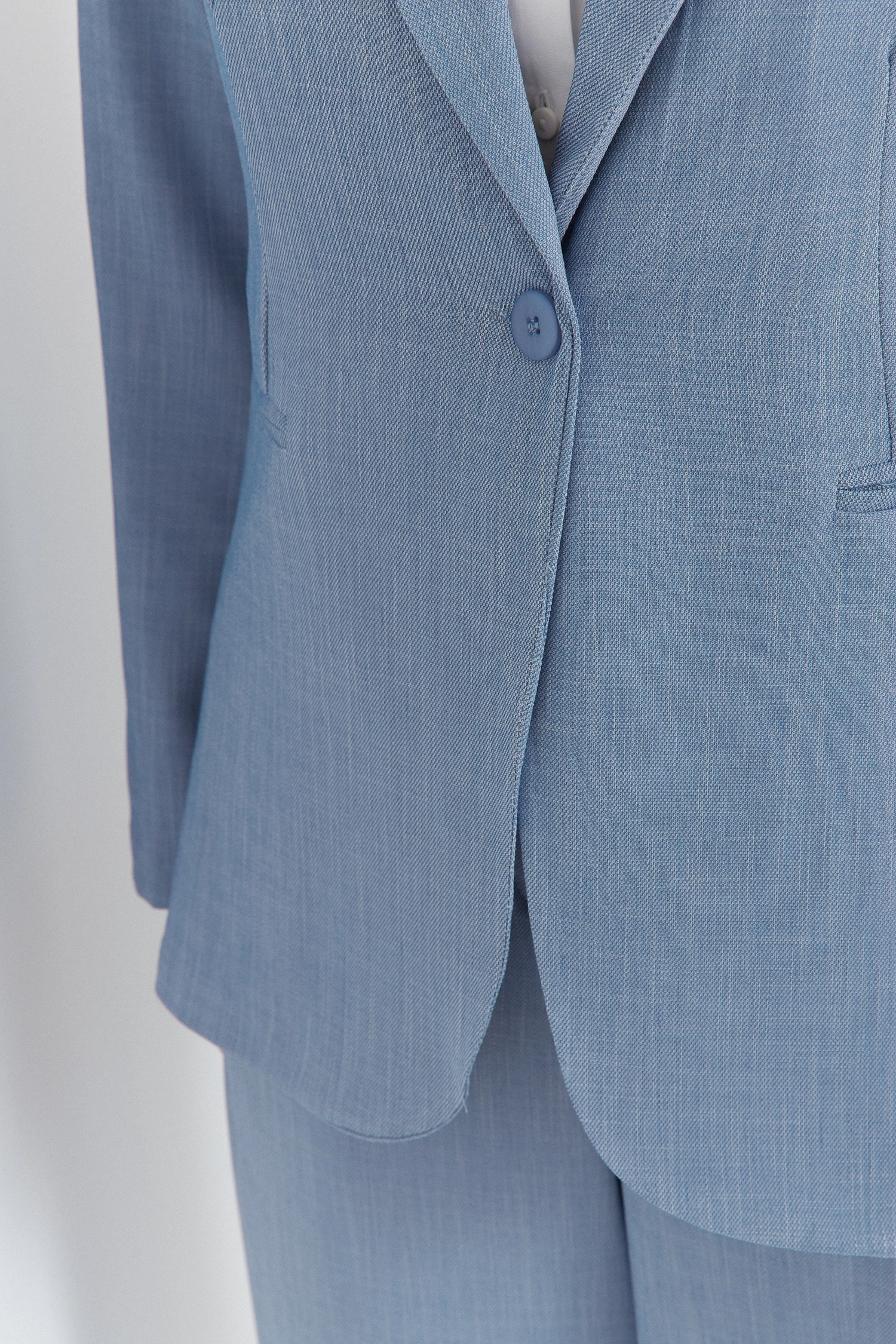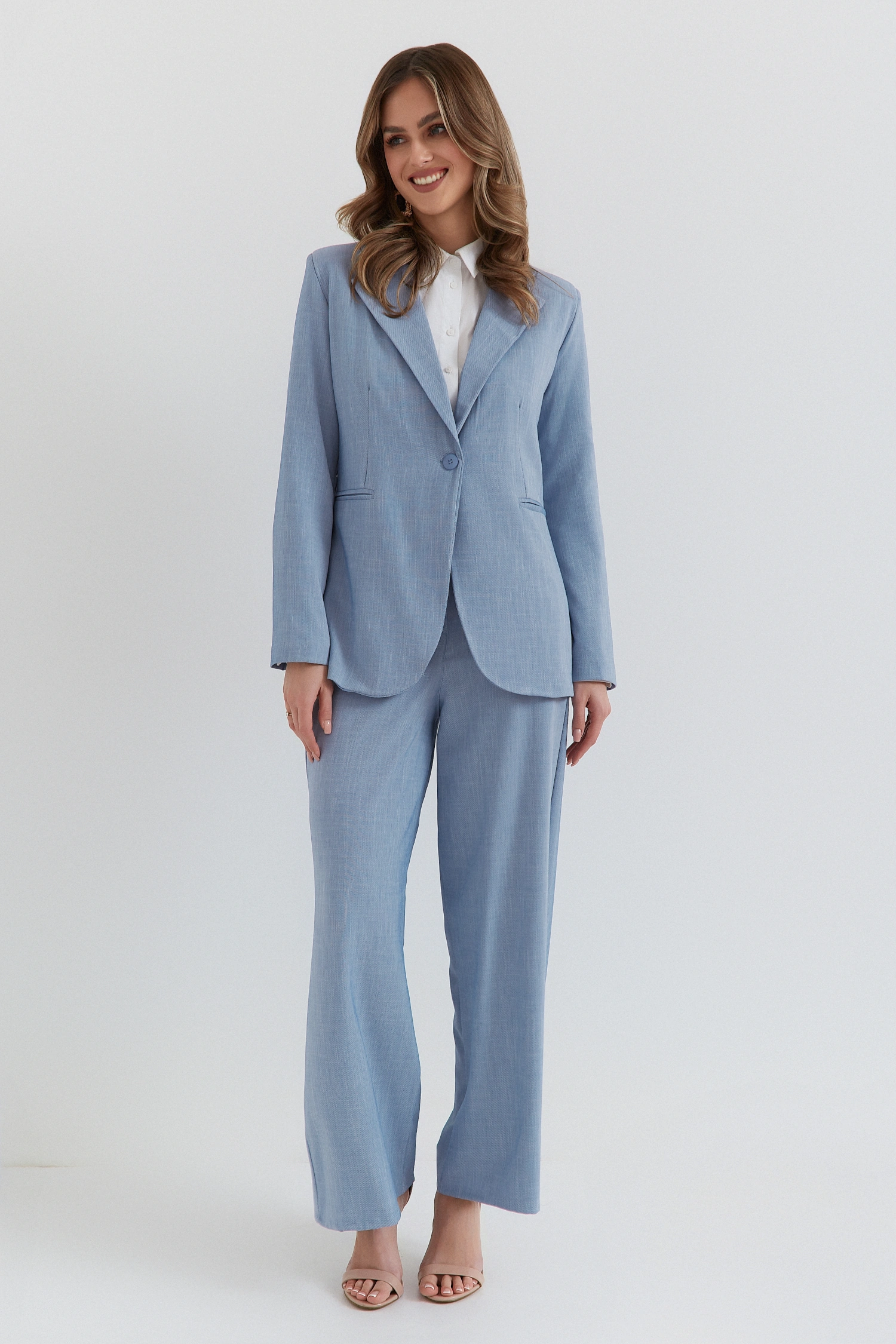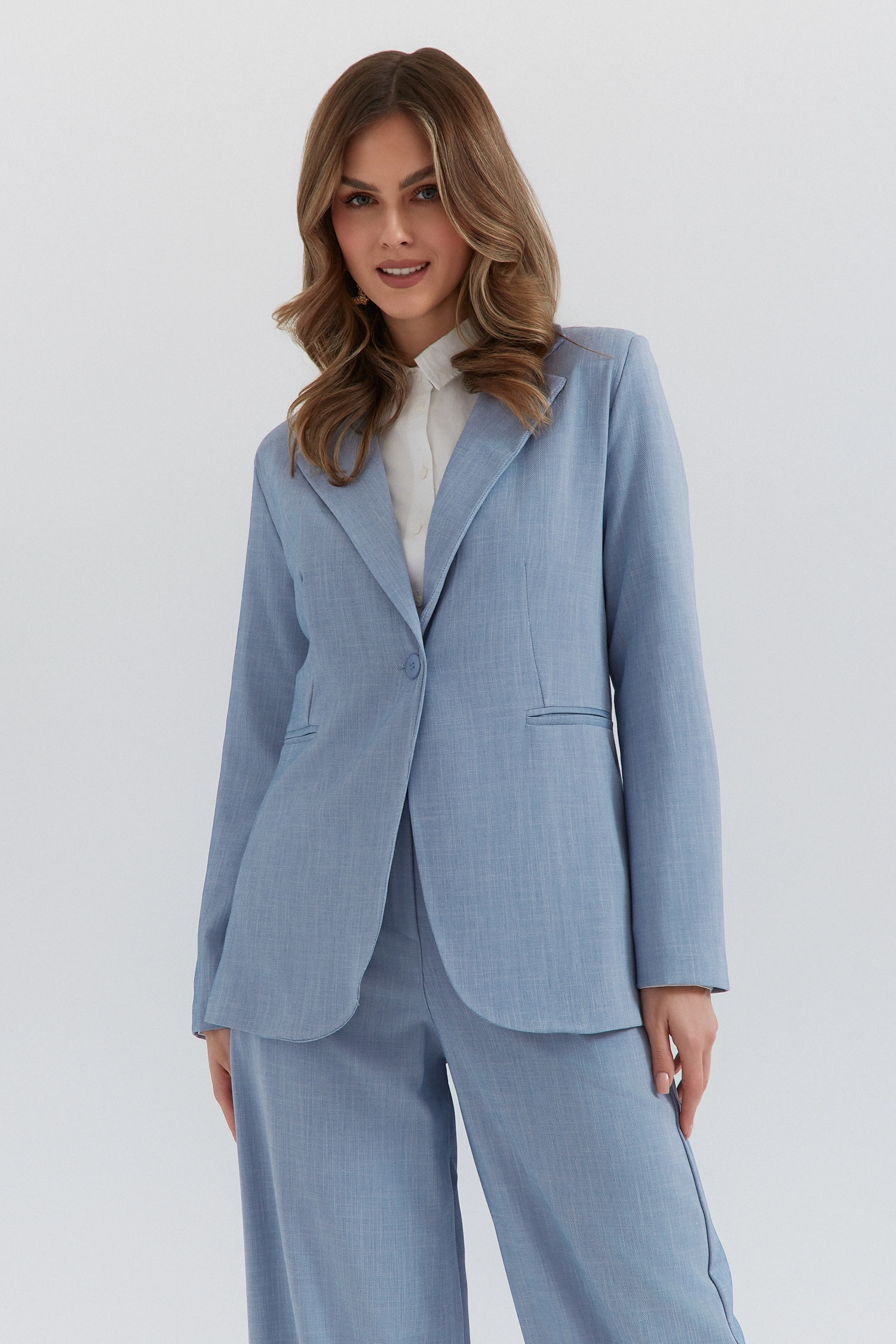 Podkreśl swój styl z naszym eleganckim garniturem damskim, który łączy klasykę z nowoczesnym luzem. Wydłużona, taliowana marynarka zapinana na jeden guzik doskonale modeluje sylwetkę, a wykładany kołnierz dodaje jej szyku. Lekka podszewka zapewnia komfort noszenia przez cały dzień.