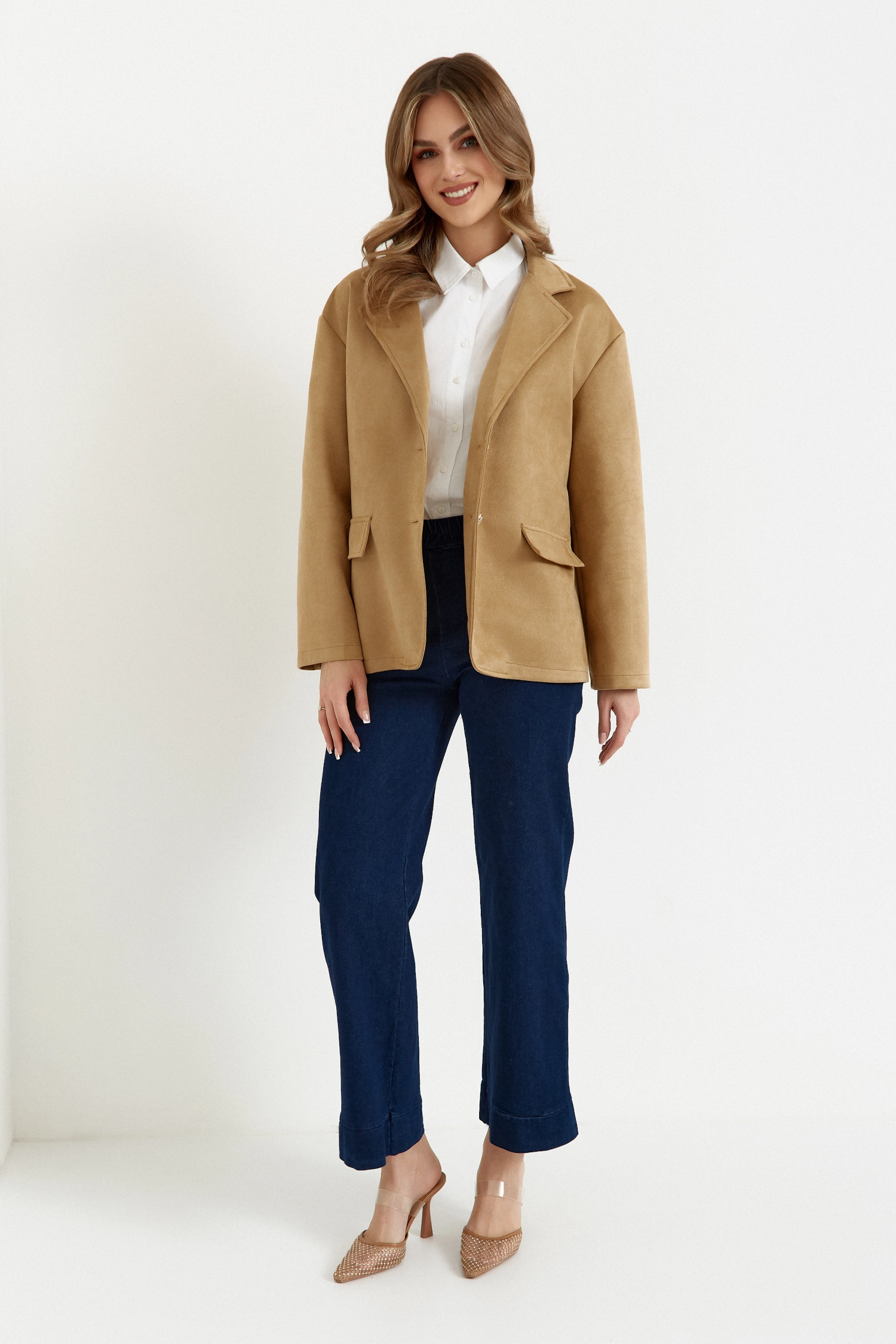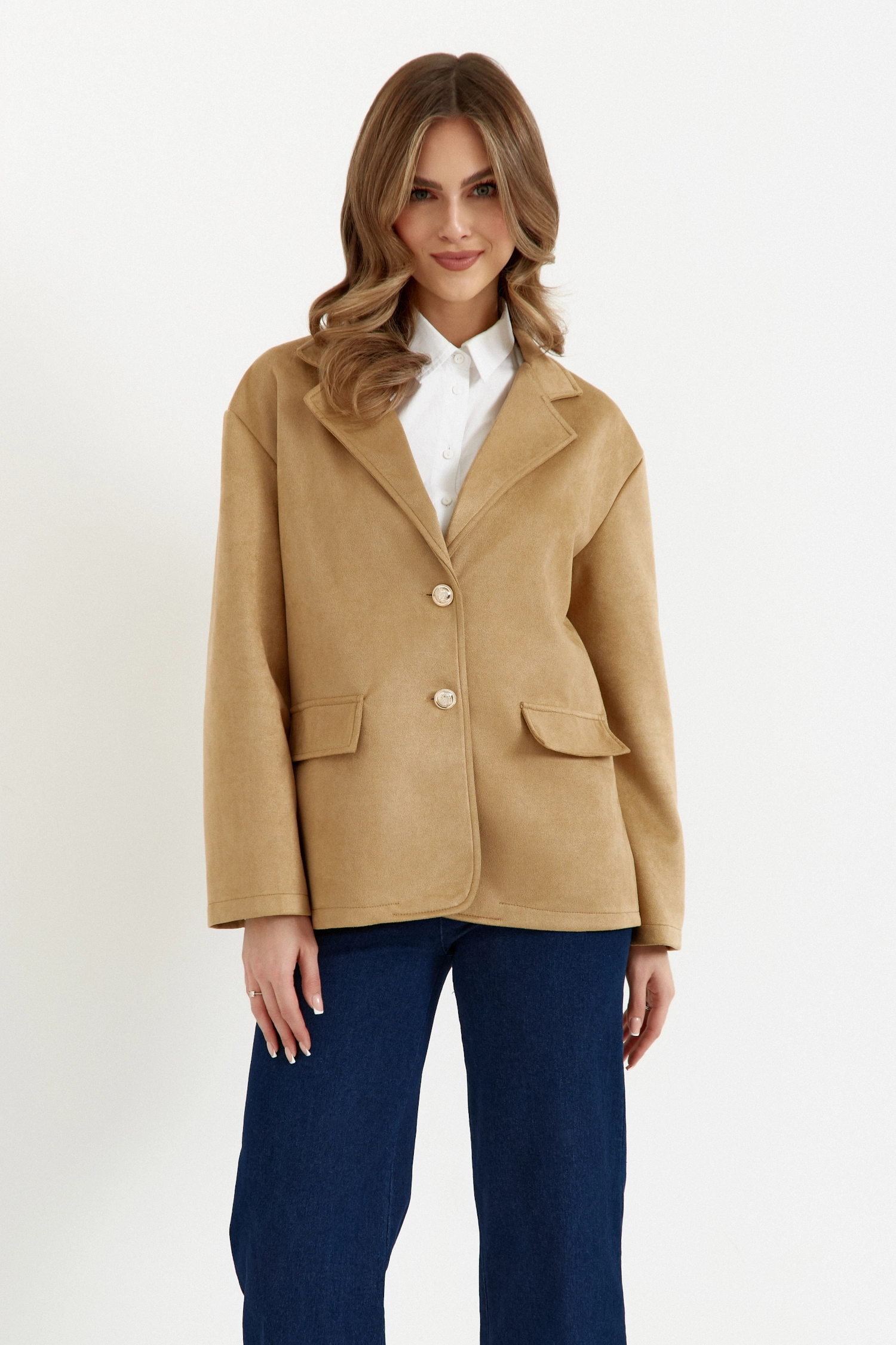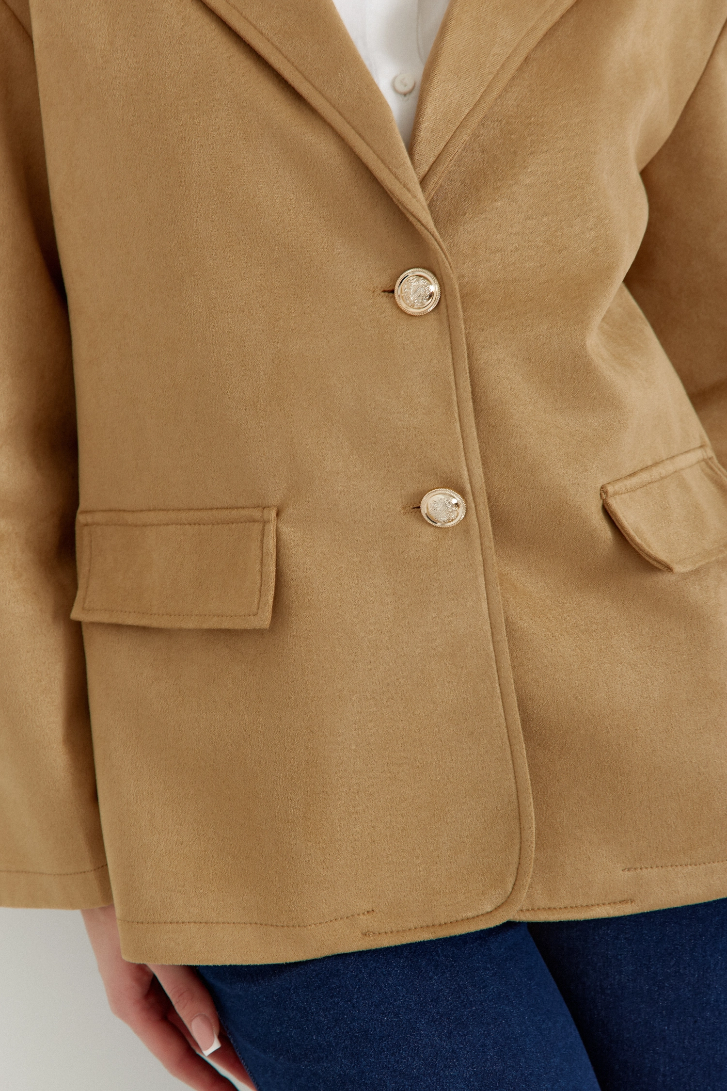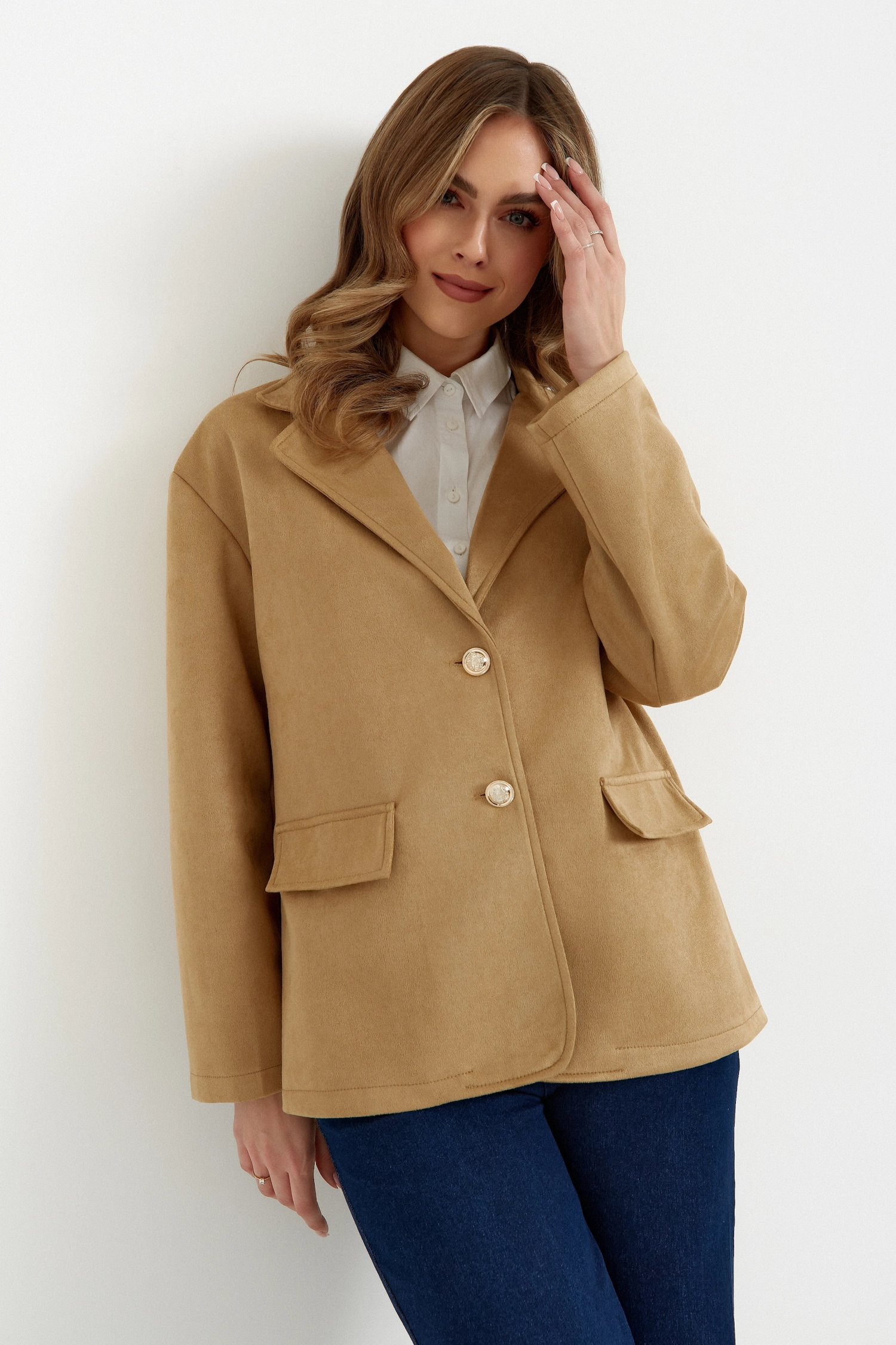 Podkreśl swój wyjątkowy styl dzięki naszej jednorzędowej marynarce zamszowej. Jej wydłużony krój subtelnie wysmukla sylwetkę, a wykładany kołnierz nadaje całości klasycznego charakteru.