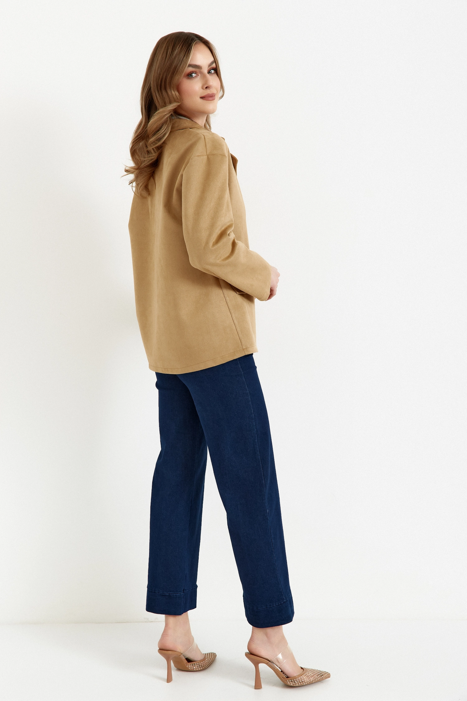 Dzięki raglanowym rękawom marynarka zapewnia komfort i swobodę ruchów, a brak podszewki sprawia, że jest lekka i idealna na różne okazje – od codziennych stylizacji po eleganckie wyjścia. Miękka, zamszowa tkanina dodaje jej luksusowego wyglądu, który nigdy nie wychodzi z mody.