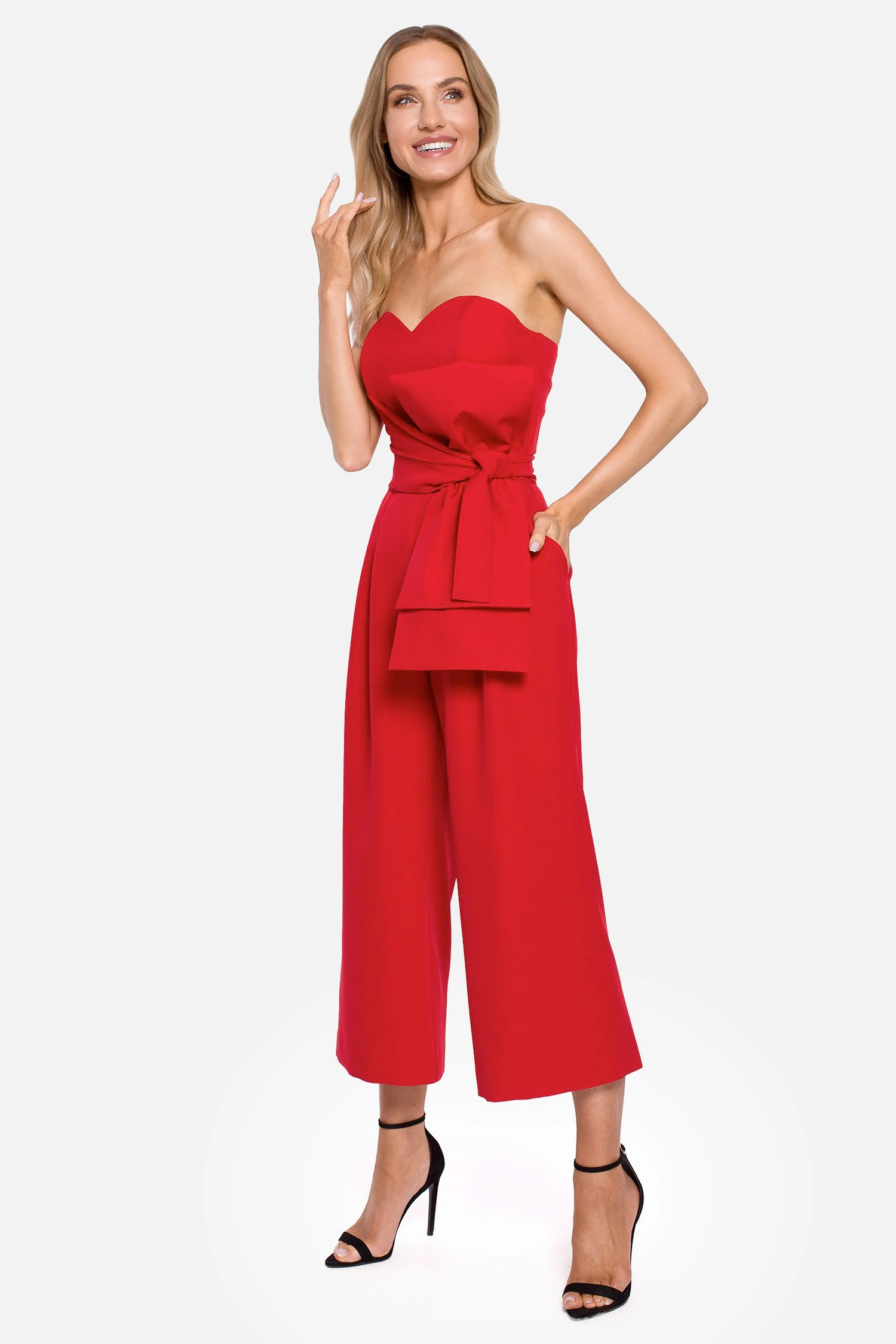 Góra kombinezonu to efektowna gorsetowa konstrukcja, która przyciąga uwagę swoimi mocnymi detalami. Bez rękawów i ramiączek, góra jest usztywniona fiszbinami, co nadaje jej wyjątkowej elegancji i pewności siebie. Z tyłu znajduje się kryty zamek, który zapewnia łatwe zakładanie i zdejmowanie kombinezonu.