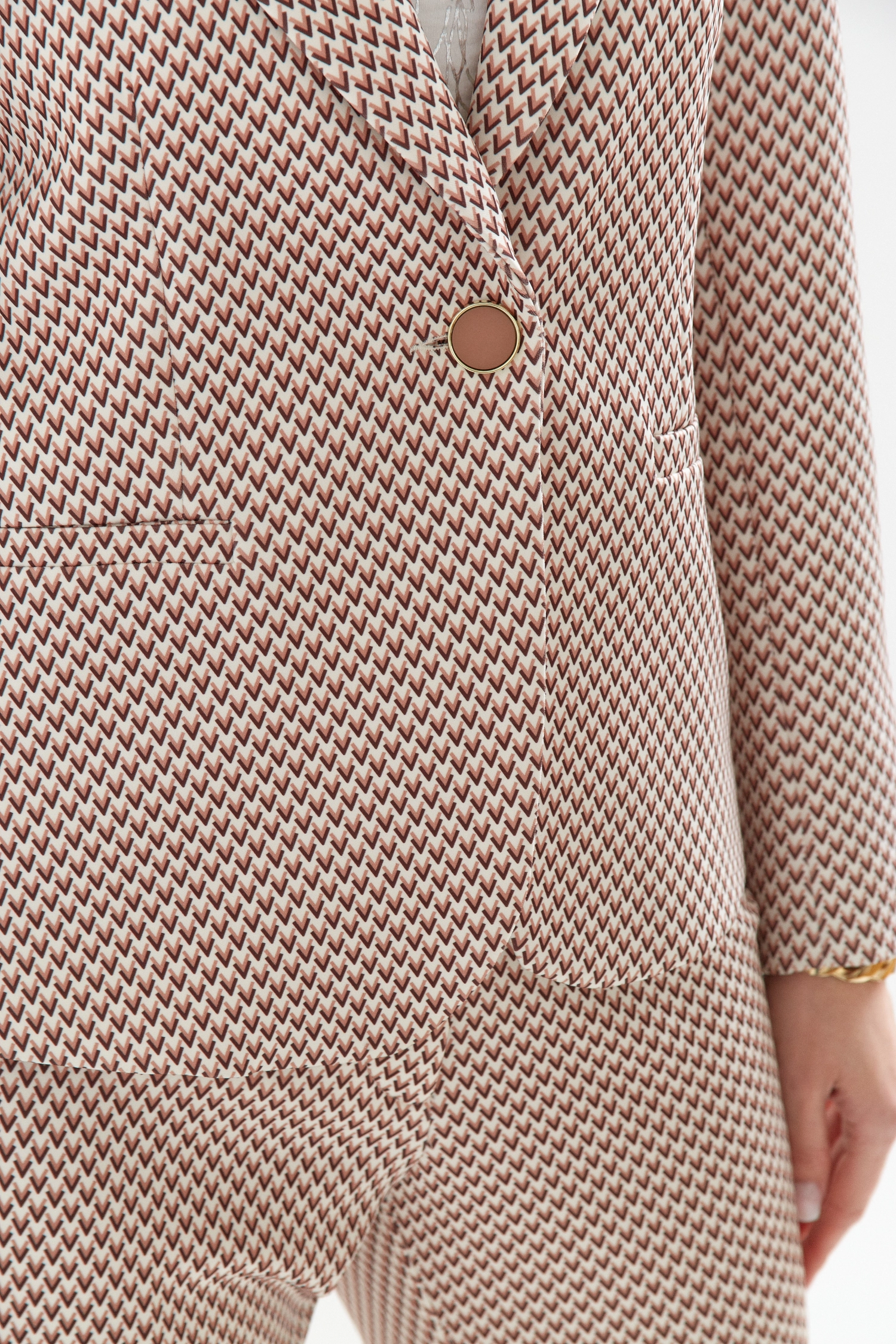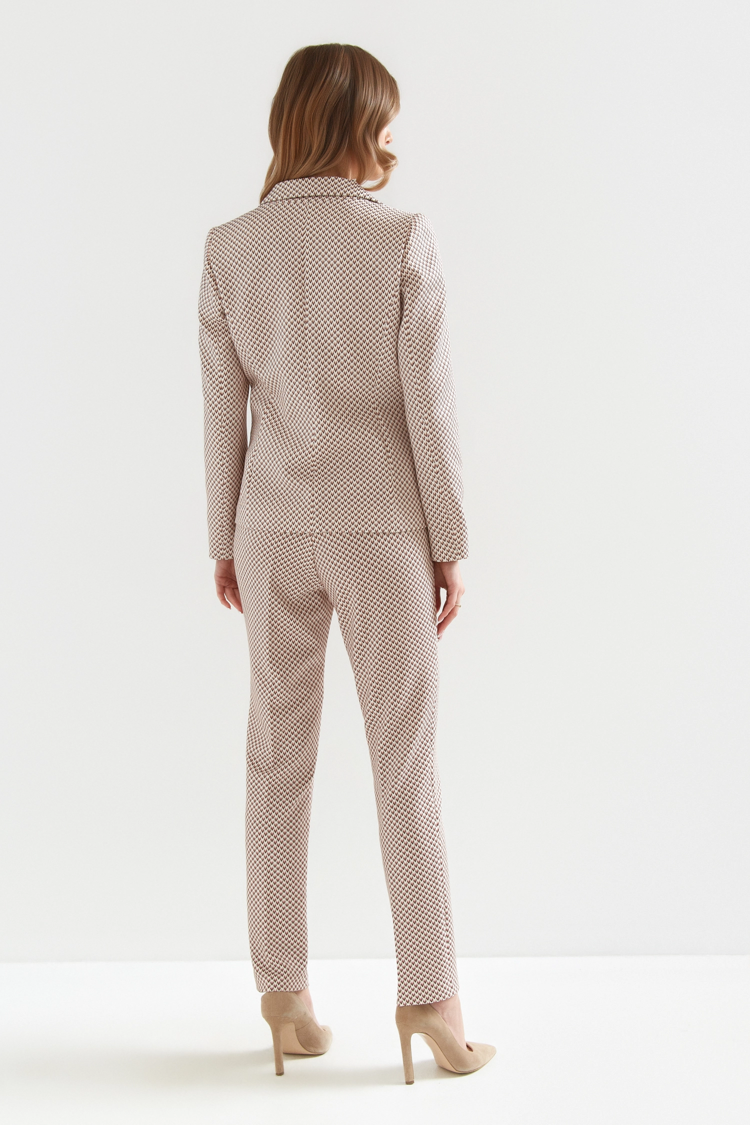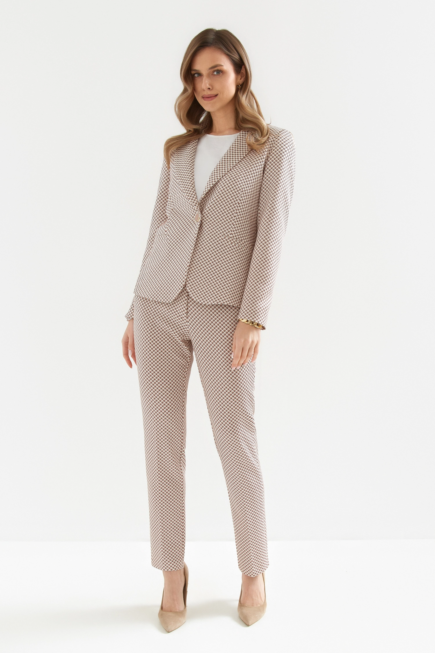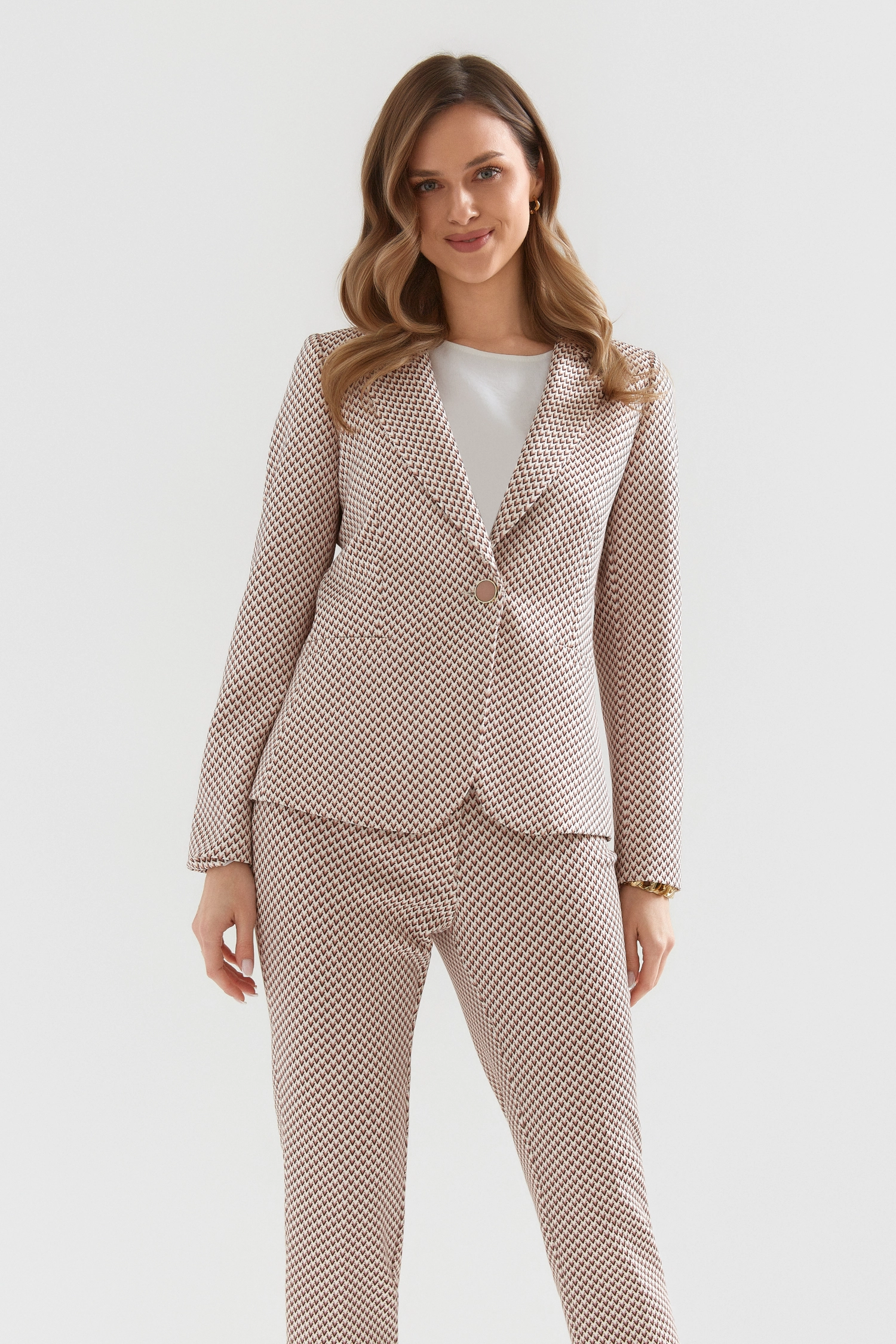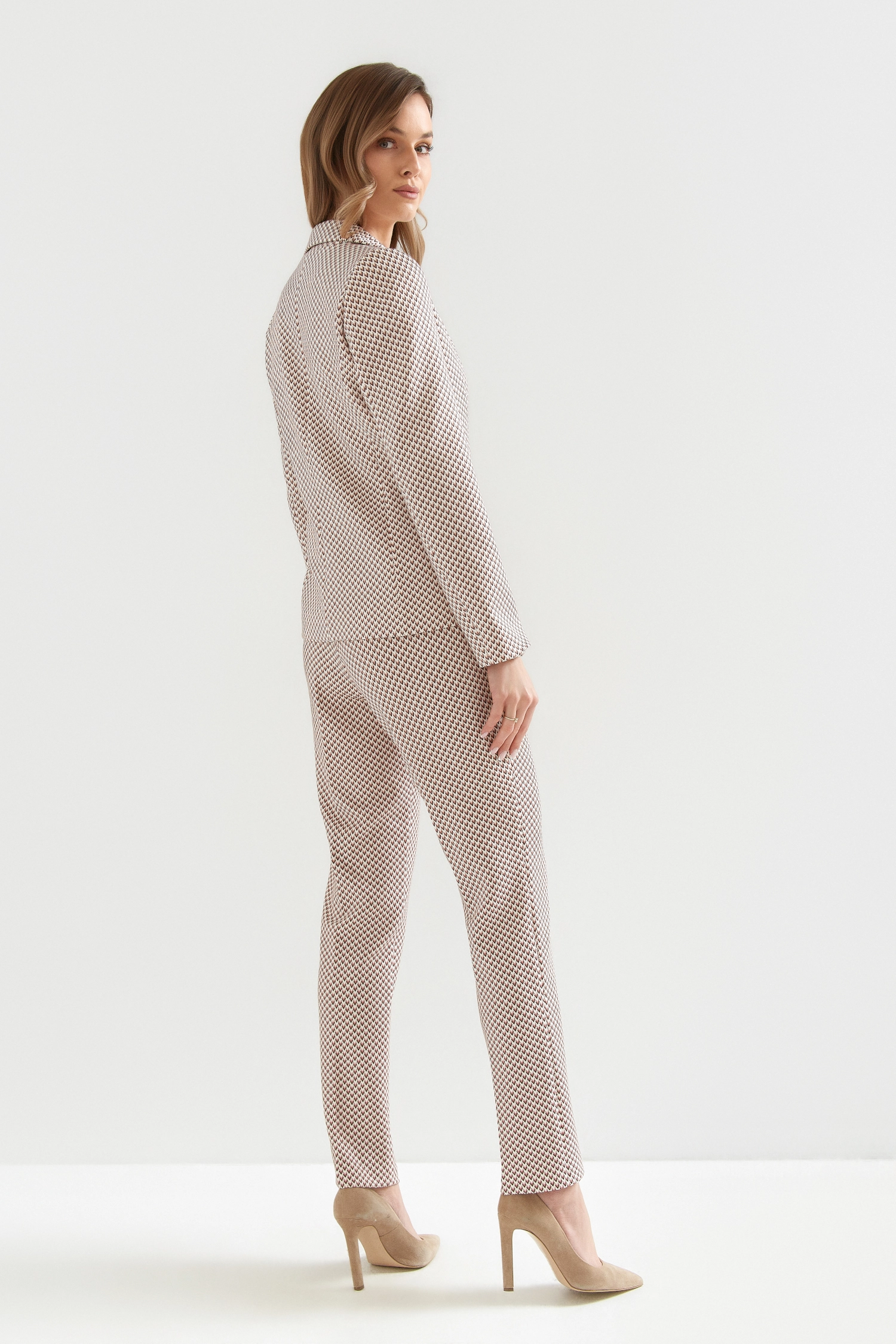 Garnitur damski Bali z niepowtarzalnym, nowoczesnym printem ,zaprojektowanym specjalnie dla Was, to must-have każdej współczesnej kobiety. Garnitur składa się z modnych spodni – cygaretek oraz klasycznej marynarki zapinanej na zdobiony guzik wykonanych z miękkiej i elastycznej tkaniny.