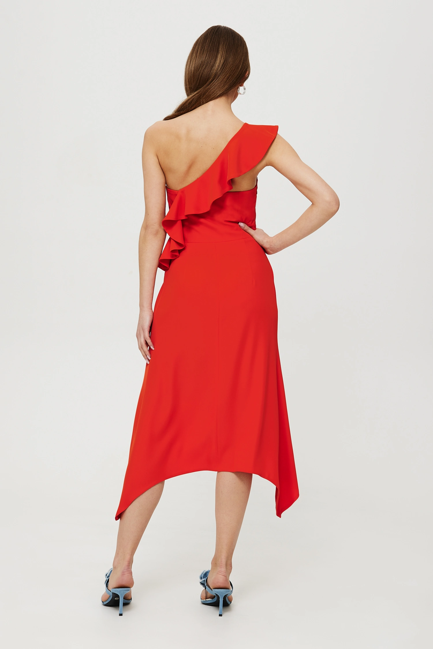 KORALOWA SUKIENKA Z FALBANĄ NA JEDNO RAMIĘ