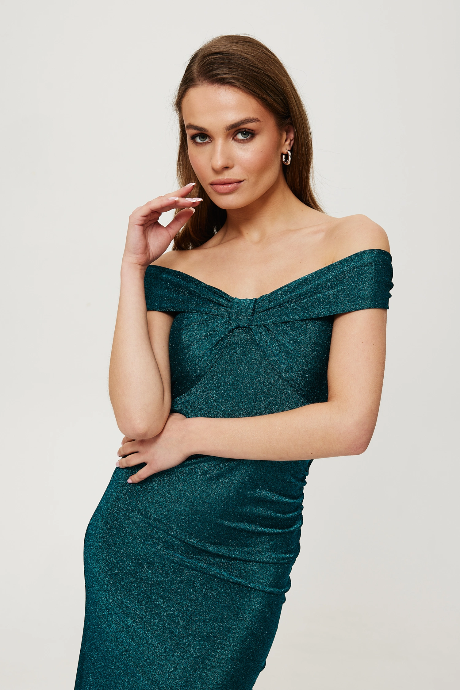 Ta morska sukienka ściągana na boku to doskonały wybór dla kobiet ceniących sobie nowoczesny styl i elegancję. Wykonana z dzianiny z metaliczną nitką, sukienka jest nie tylko wyjątkowo elastyczna, ale także efektownie połyskuje, dodając blasku każdej stylizacji.