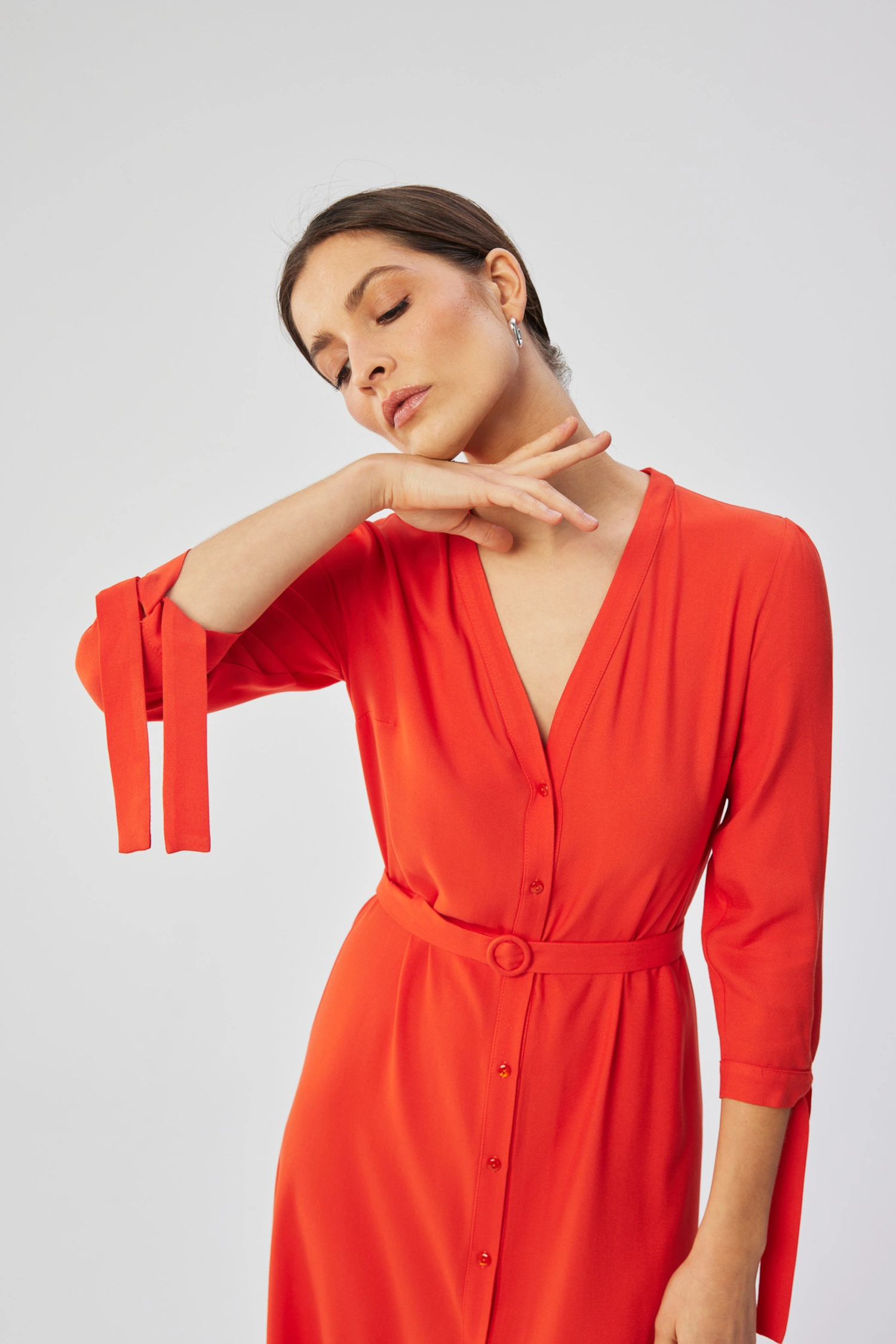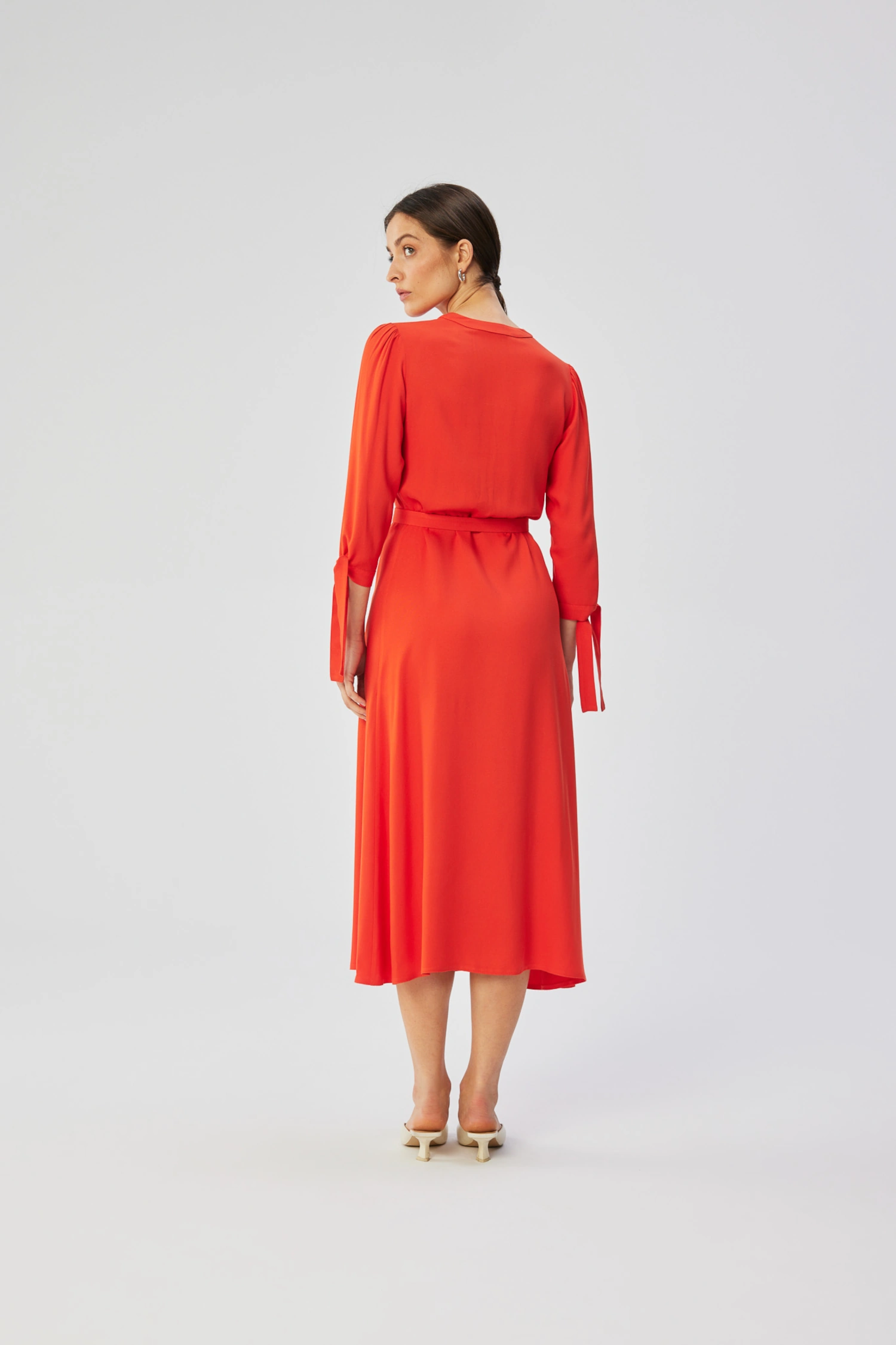 Sukienka midi z wiązanymi mankietami to harmonijne połączenie wygody i szyku. Wykonana z delikatnej tkaniny składającej się w 100% z wiskozy sukienka zachwyca elegancją i lekkością.