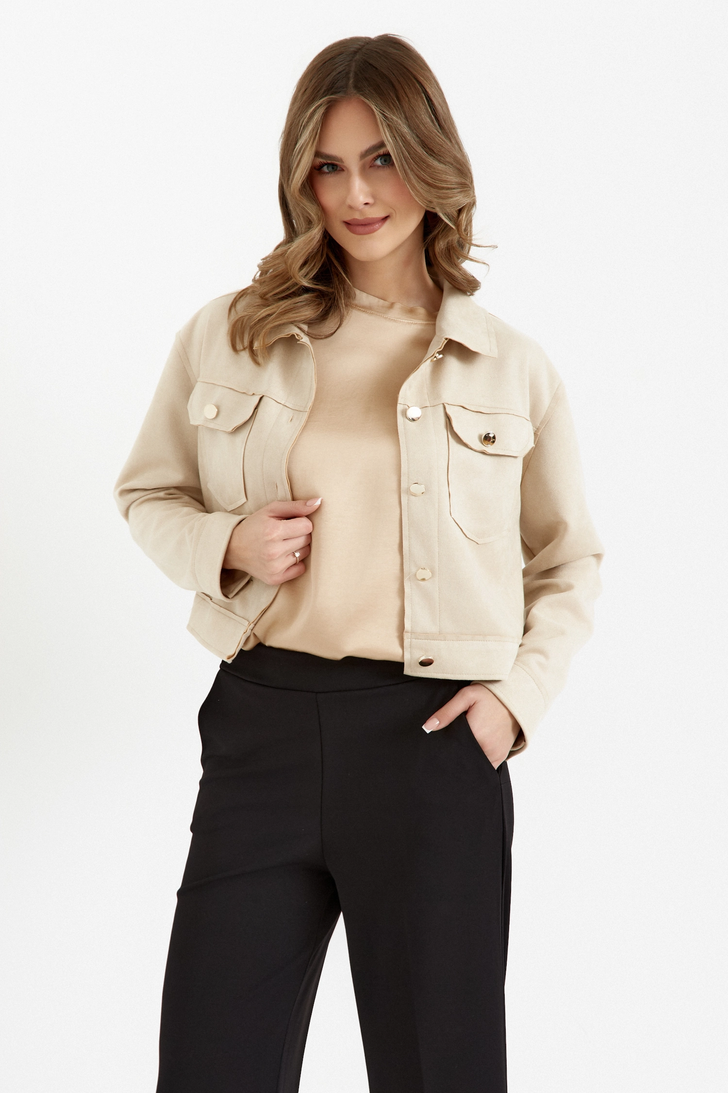 Wzbogać swoją garderobę o ponadczasową kurtkę zamszową o krótkim, pudełkowym kroju. To idealne połączenie klasyki i nowoczesności, które doskonale komponuje się zarówno z casualowymi, jak i eleganckimi stylizacjami.